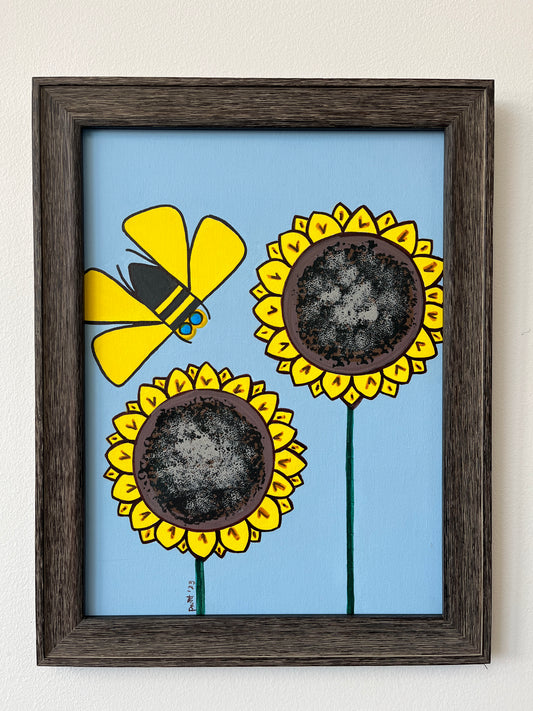 Framed Painting of Sunflower Duet Beneath Blue Skies