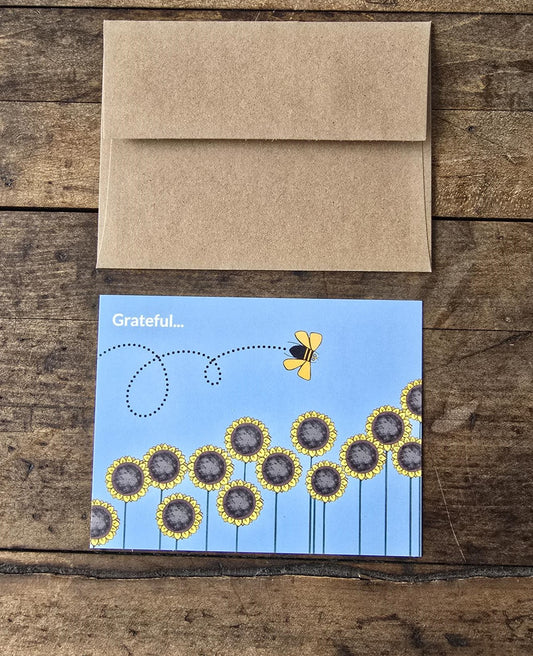 Set of 10 "Grateful..." Sunflower Beeline Flat Blue Note Card W/Kraft Envelope